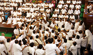 திமுக சட்டப்பேரவை உறுப்பினர் பூங்கோதை மேஜை மீது ஏறி நின்று வாக்குவாதத்தில் ஈடுபட்டார். இருக்கைகளை தட்டியும், காகிதங்களைக் கிழித்தெறிந்தும் எதிர்க்கட்சியினர் கடும் அமளியில் ஈடுபட்டனர். அவர்கள் அமைதி காக்காததைக் கண்டித்து பேரவையில் இருந்து சபாநாயகர் வெளியேறினார். சபாநாயகரை பாதுகாப்பாக அவை காவலர்கள் அழைத்துச் சென்றனர். இந்நிலையில் சட்டசபை கூட்டம் 1 மணி வரை ஒத்திவைக்கப்பட்டது.